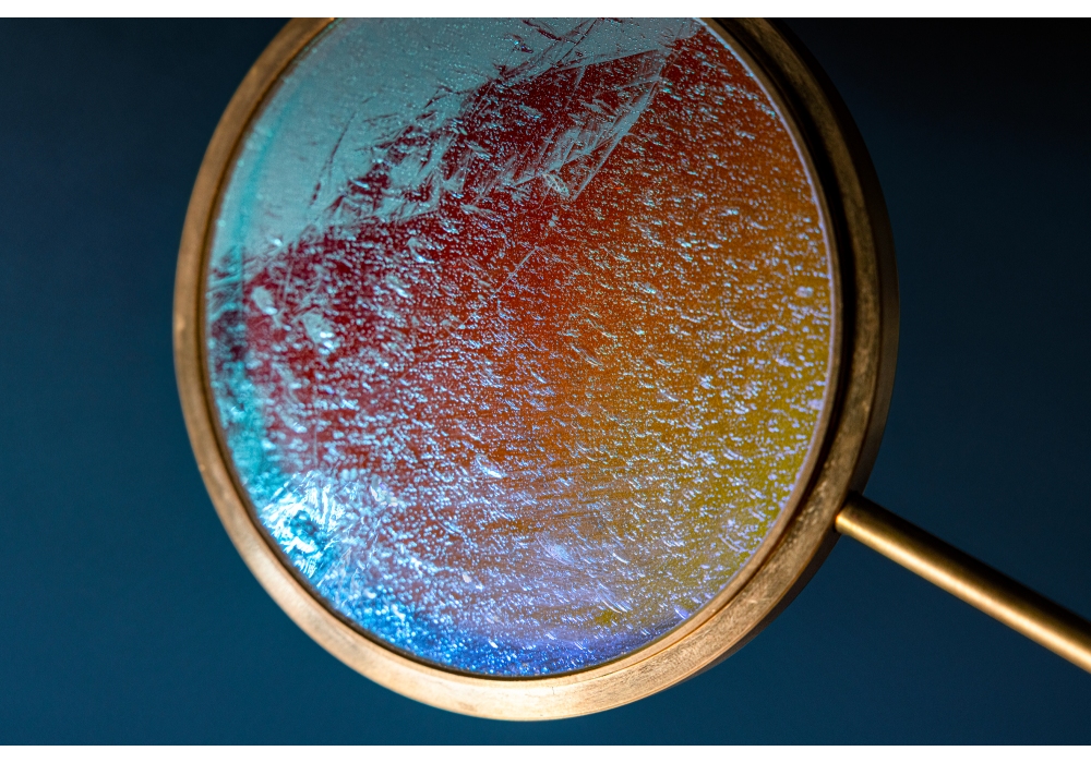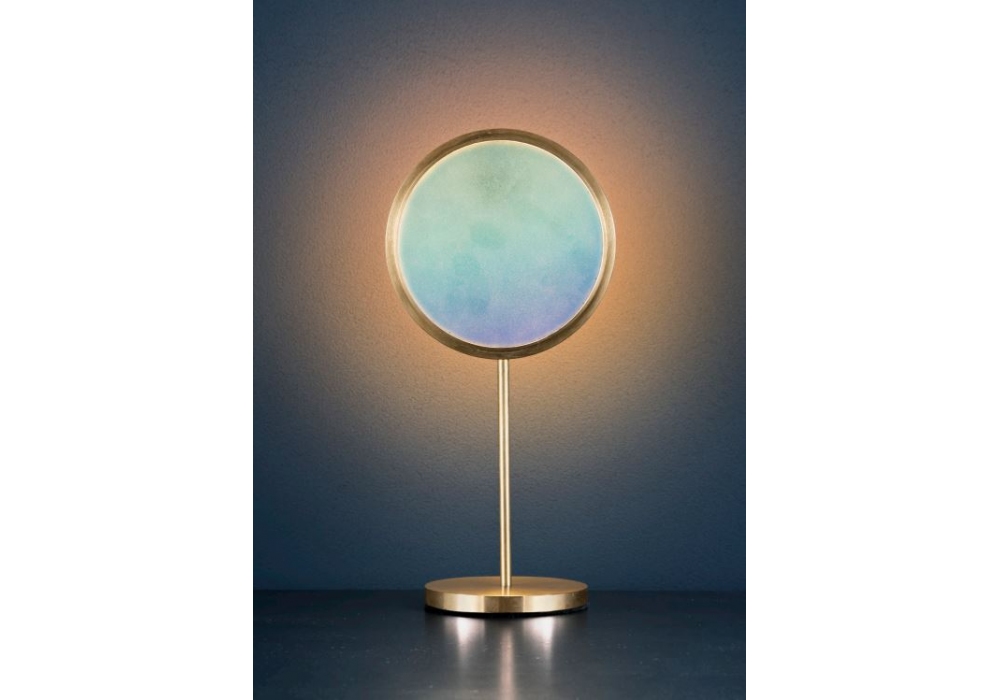 Talismano (Other Smiths), von Enzo Catellani für Catellani & Smith entworfen, ist eine Tischlampe mit unbehandelter Messingstruktur und irisierendem handgefertigtem Glasdiffusor in irisierender Farbe.