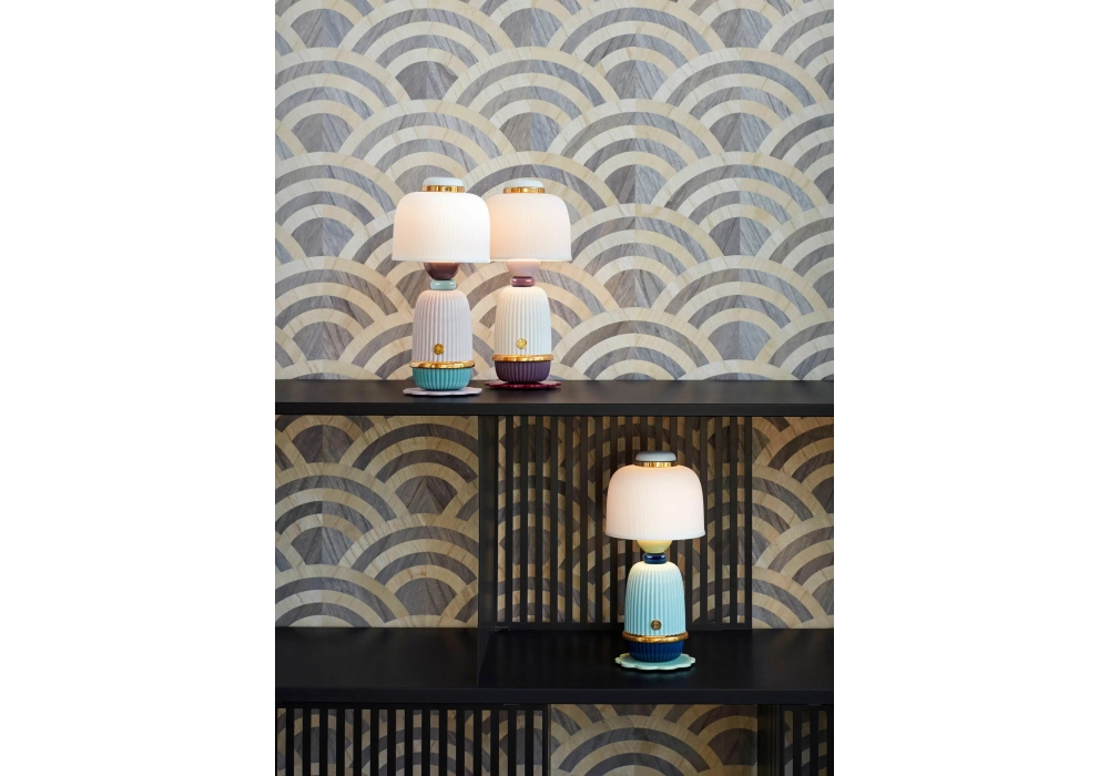Kokeshi von Robert Schnyder für Lladró entworfen, ist eine tragbare, batteriebetriebene Tischleuchte. Der Leuchtenkörper besteht aus glänzendem Porzellan und ist in verschiedenen Ausführungen erhältlich, während der Lampenschirm tulpenförmig aus mattem Porzellan ist.