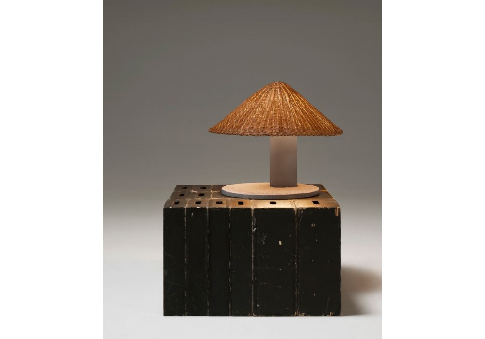 Alma, von Studiopepe für Tacchini entworfen, ist eine Tischlampe mit handgeflochtenem Korbschirm, Betonstruktur und Steinsockel.