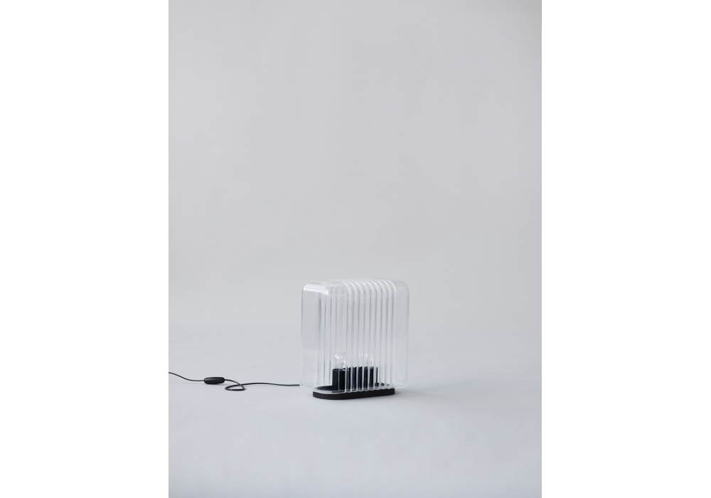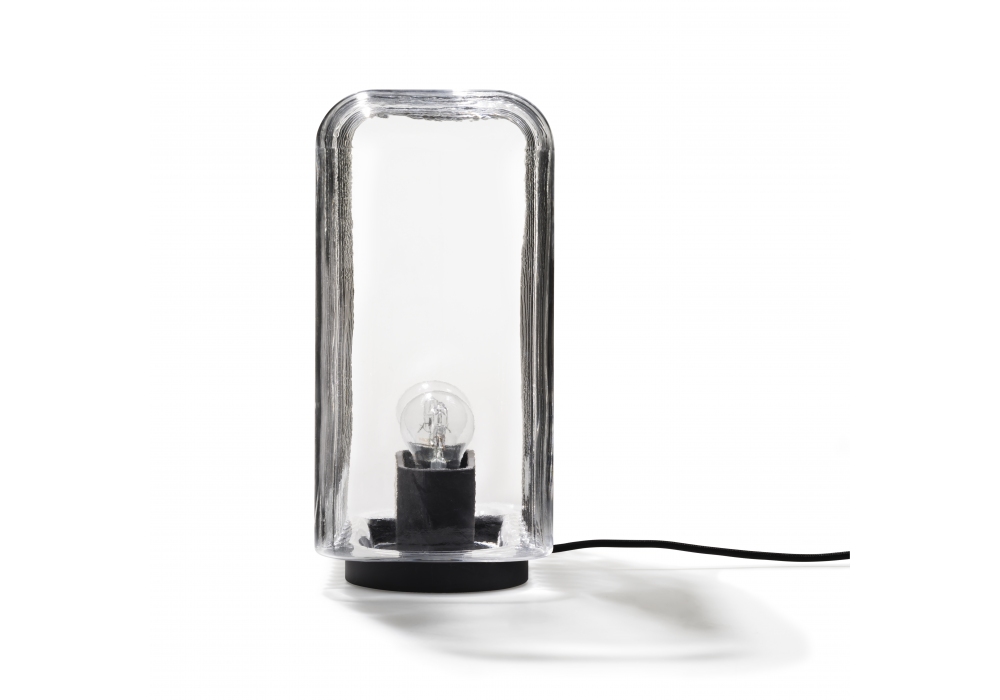 Lari von Angelo Mangiarotti für Karakter entworfen, ist eine Tischleuchte mit mundgeblasenem Glaslampenschirm, schwarz pulverbeschichtetem Aluminiumfuß und schwarzem Gewebekabel mit Dimmer.
