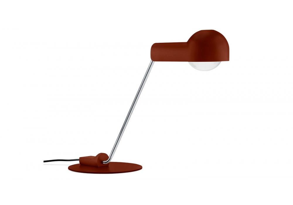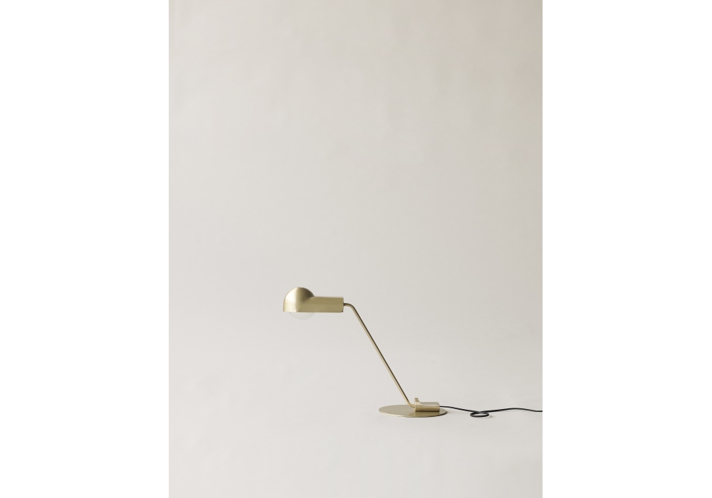 Domo Table von Joe Colombo für Karakter entworfen, ist eine Tischleuchte aus Messing mit gebürsteter Oberfläche und transparentem Lack, Stahl mit schwarzer Pulverbeschichtung oder Stahl mit pulverbeschichtetem Lampenkopf und -fuß und verchromtem Stiel. Verfügbar in mehreren Ausführungen.