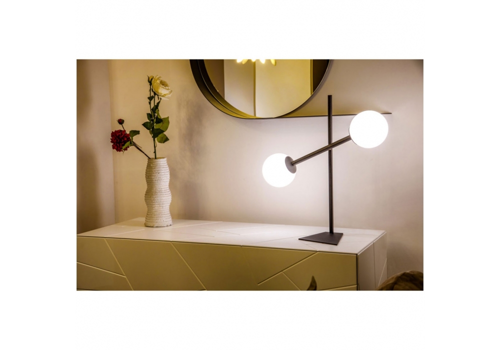 Meridian T Big von Riflessi entworfen, ist eine Tischleuchte mit um 360 Grad verstellbarer Lampenbefestigung. Metallstruktur, gebrannte Epoxidfarbe und elektrisches Kabel aus schwarzem Stoff. Die Lichtquelle kommt von weißen satinierten Glaskolben. Verfügbar in mehreren Ausführungen.