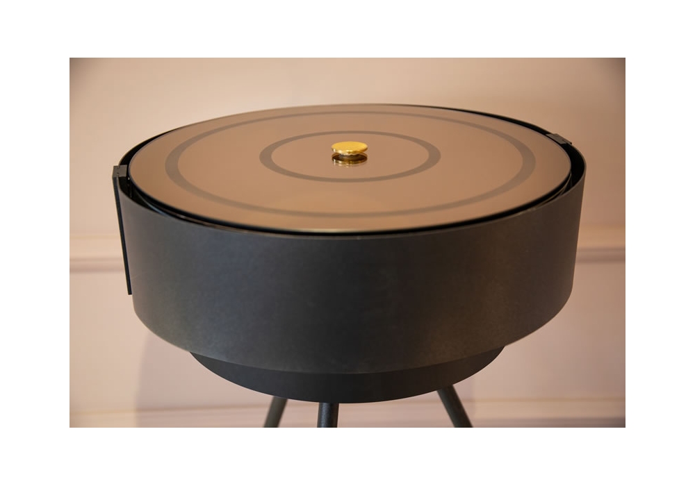 Planet von Riflessi entworfen, ist eine Tischleuchte mit Metallstruktur. Erhältlich in der Version, die vollständig mit Epoxidbehandlung in Graphit lackiert ist, oder mit oberem Kreis und Beinen, die mit Epoxidbehandlung in Graphit oder Rotgold lackiert sind, und unterem Kreis, die mit Kupfer-Galvanik-Satin-Behandlung lackiert sind.