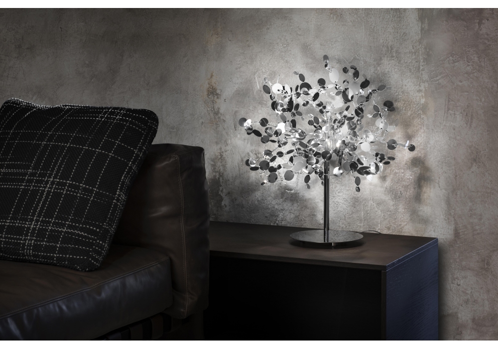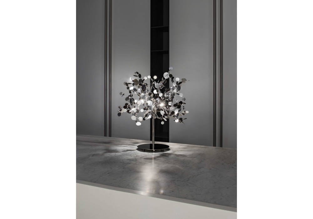 Argent von Dodo Arslan für Terzani entworfen, ist eine Tischlampe mit runder Basis und röhrenförmigem Stab aus plattiertem Stahl. Die Reflektoren sind durch mehrfache Applikationen in plattiertem Stahl strukturiert. Die verwendete Lichtquelle ist vom LED-Typ. Argent ist in verschiedenen Ausführungen erhältlich.