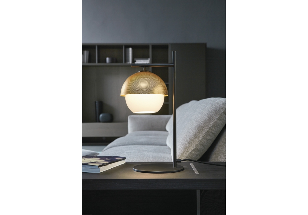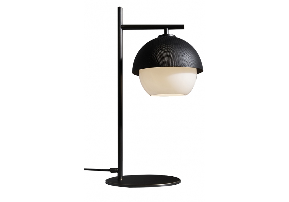 Urban diseñada por Massimo Tonetto para Venicem es una lámpara de mesa con luz difusa. Estructura de latón bruñido claro u oscuro con pantalla de metal perforado dorado mate o negro mate. Difusor de cristal de Murano soplado blanco.
