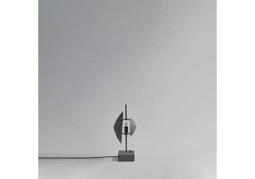 Dusk diseñada por Nicolaj Nøddesbo & Tommy Hyldahl para 101 Copenhagen es una lámpara de mesa caracterizada por dos pantallas redondeadas realizadas en aluminio oxidado.