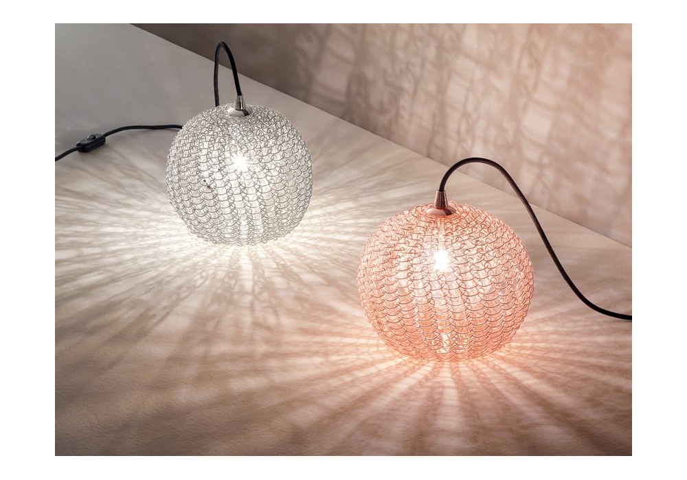 Luce von Domenico Rinaldi für Fisionarte entworfen, ist eine kugelförmige Tischleuchte mit Details aus schwarz verchromtem oder kupferbeschichtetem Metall. Der Lampenkörper besteht aus gewebtem Metallgeflecht und nimmt eine LED- oder Halogenlichtquelle mit G9-Fassung auf. Luce ist in verschiedenen Ausführungen erhältlich.