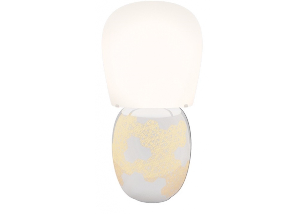 Hive von Ini Archibong für Kundalini entworfen, ist eine Tischleuchte mit Diffusor aus geschichtetem und geblasenem Opalglas. Körper aus glasierter Keramik, verziert mit der Technik des "dritten Feuers". Verfügbar in verschiedenen Ausführungen.