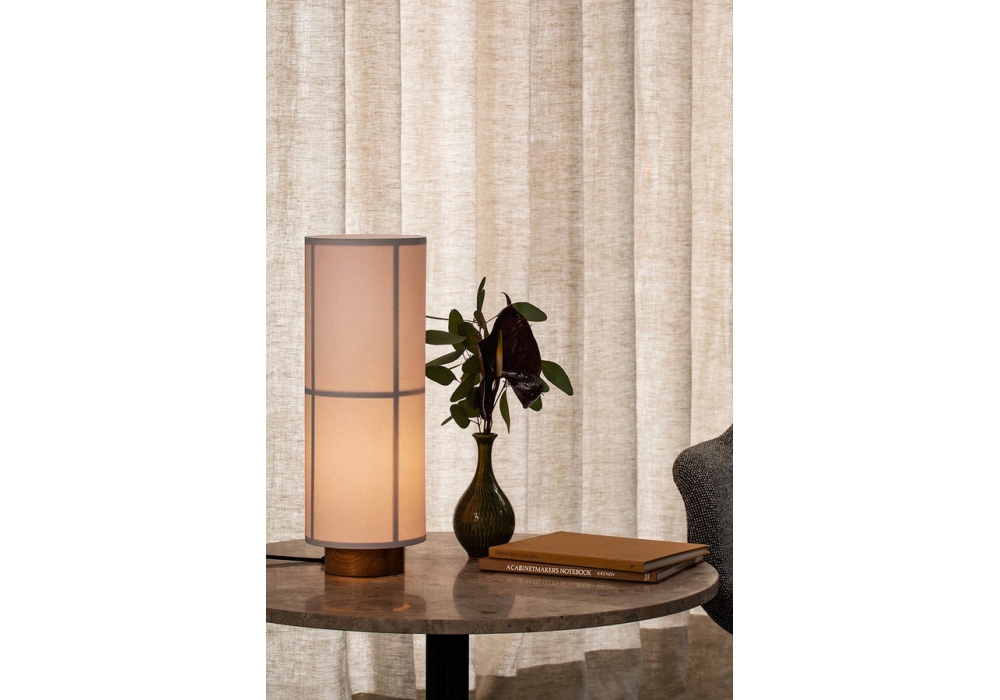 Hashira von Norm Architects für Audo Copenhagen entworfen, ist eine Tischlampe mit Metallstruktur und durchscheinendem Lampenschirm aus Stoff, verfügbar in verschiedenen Ausführungen.