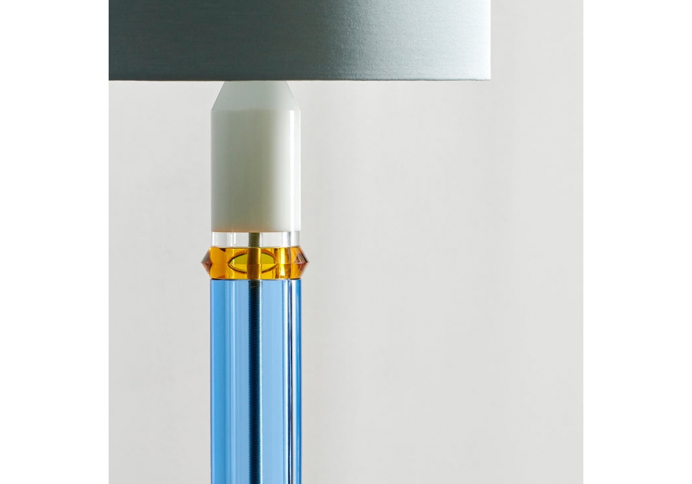 Carnival NO. 1 von Design By Us für Reflections Copenhagen entworfen, ist eine Tischlampe mit tragender Struktur aus Metall, das mit Messing und hellblauem röhrenförmigem Kristall überzogen ist. Der Lampenschirm hat eine zylindrische Form, ist mit Leinen bezogen und schirmt eine LED-Lichtquelle mit E27-Fassung ab.
