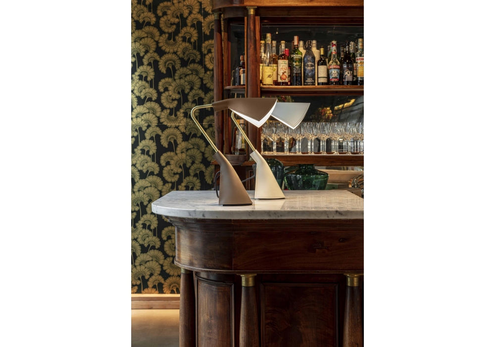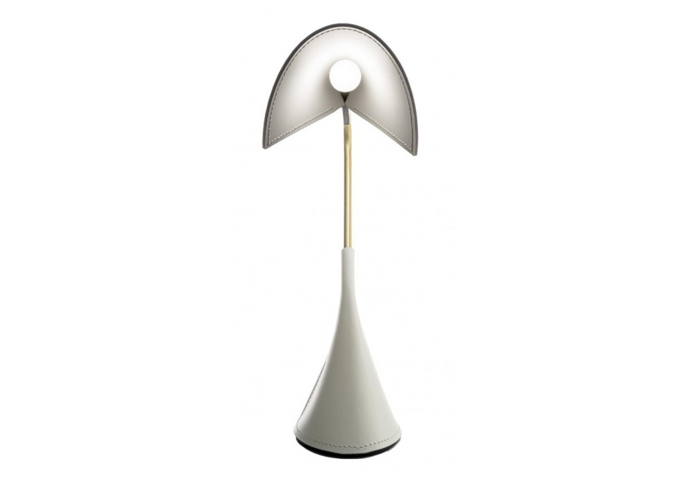 Duffy von Stefano Santilio für Enrico Pellizzoni entworfen, ist eine Tischlampe aus satiniertem oder weiß lackiertem Messing, Sockel und Diffusor mit Leder bezogen, in verschiedenen Farben erhältlich.
