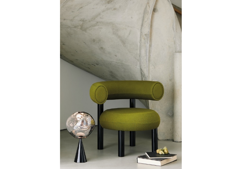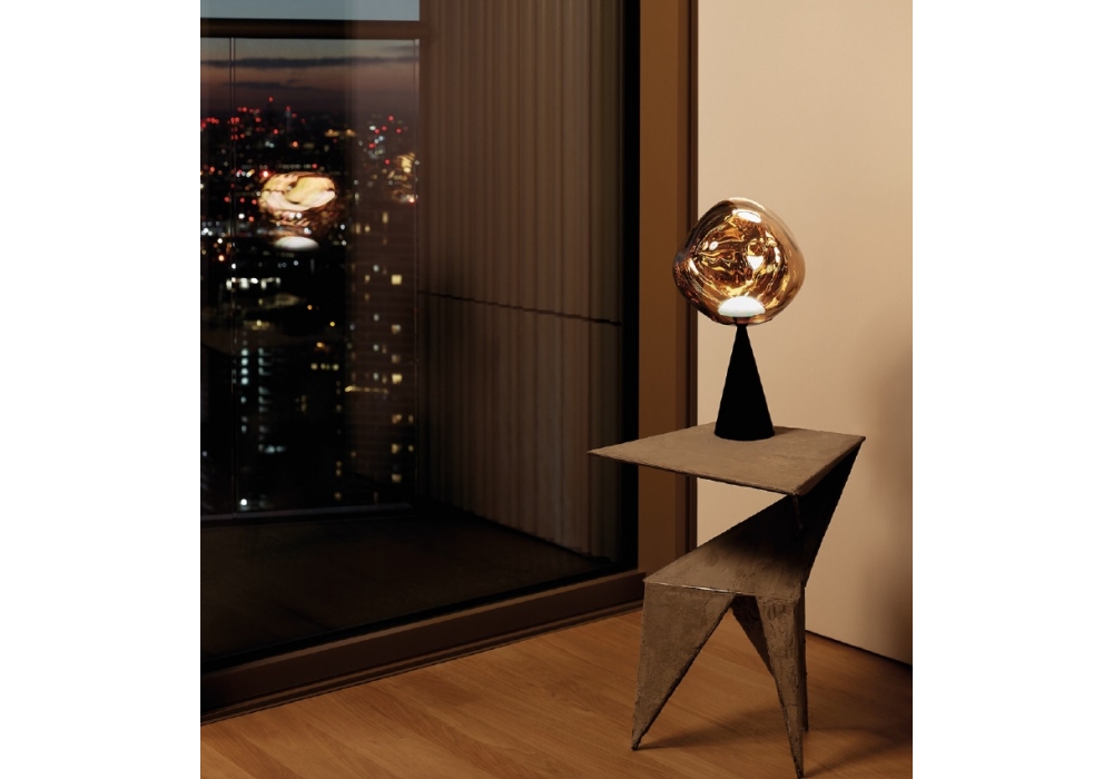 Melt Cone Fat von Tom Dixon entworfen, ist eine Tischlampe, die sich durch einen glänzend schwarzen Stahlsockel und einen Polycarbonat-Diffusor auszeichnet, der in verschiedenen Ausführungen erhältlich ist.