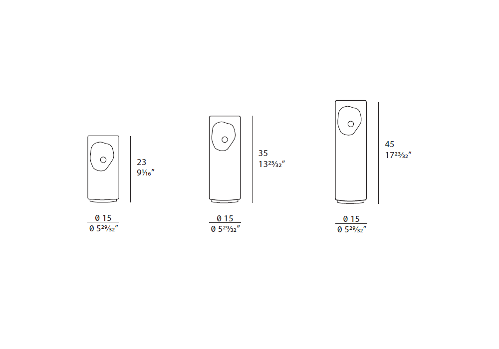 | Abmessungen | Ø 15 x H 23 cm; Ø 15 x H 35 cm; Ø 15 x H 45 cm. |