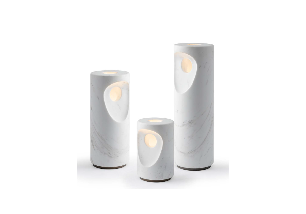 Silhouette von Gensler für Turri entworfen, ist eine Tischleuchte mit Sockel aus lackiertem Metall und Ausführung in Volakas-Marmor oder Eschenholz. Verfügbar in mehreren Abmessungen.
