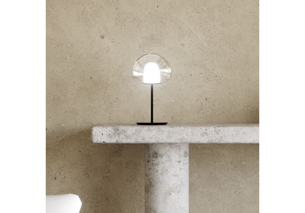 Thea von Gabriele und Oscar Buratti für Fontana Arte entworfen, ist eine Tischleuchte, die diffuses, dimmbares Licht mit einer Struktur aus verzinktem Metall und einem internen Diffusor aus säuregeätztem mundgeblasenem Glas spendet. Das Netzkabel, der Dimmer und der Stecker sind schwarz lackiert. Die Lampe speichert die letzte Dimmeinstellung. Verfügbar in zwei Dimensionen.