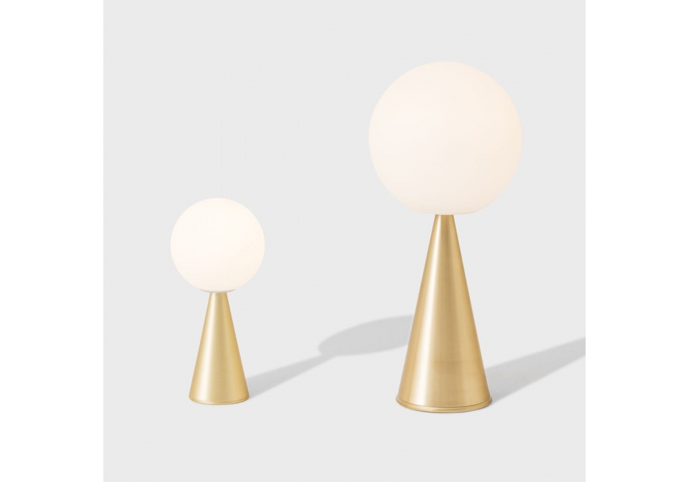 Bilia von Gio Ponti für Fontana Arte entworfen, ist eine per Knopfdruck dimmbare Tischleuchte mit diffusem Licht und Struktur aus gebürstetem oder verzinktem Metall. Diffusor aus mundgeblasenem Glas in satiniertem Weiß. Transparentes Stromkabel, Dimmer und Stecker. Verfügbar in verschiedenen Ausführungen.