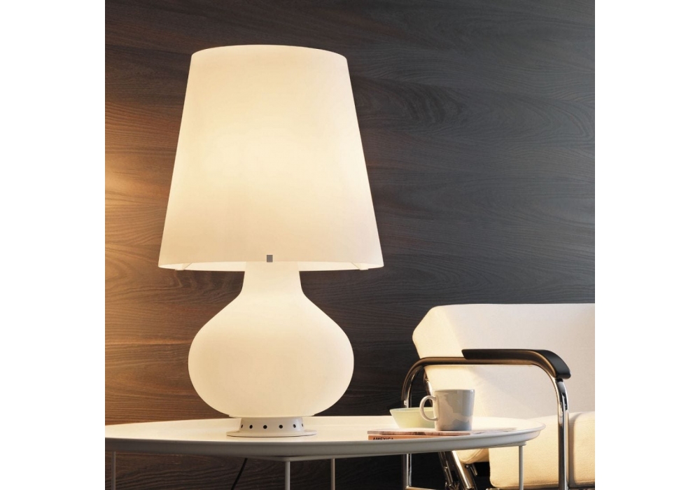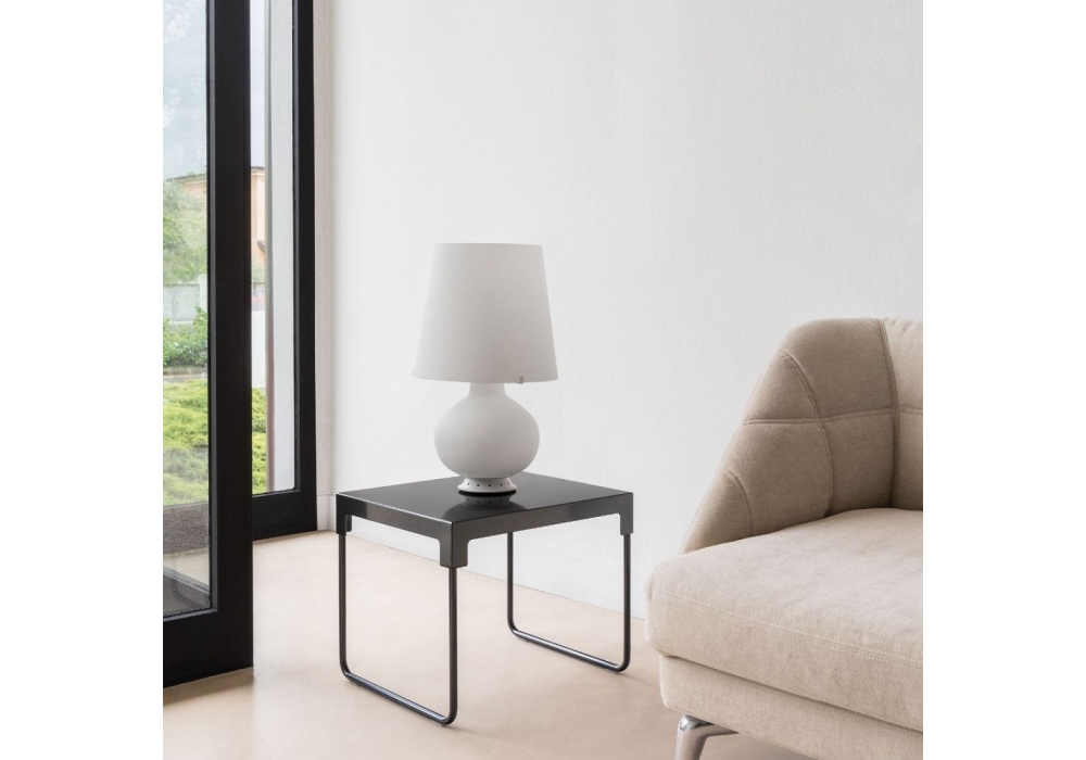 Fontana von Max Ingrand für Fontana Arte entworfen, ist eine nicht dimmbare Tischleuchte, die diffuses Licht mit einer Struktur aus lackiertem Metall, einem Diffusor und einer Basis aus weißem, satiniertem, mundgeblasenem Glas liefert. Schwarzes Netzkabel, Schalter und Stecker. Die Ø 20-Version ist mit einem Doppelschalter ausgestattet, mit dem Sie den Diffusor und den Sockel separat beleuchten können, während die Ø 47-Version mit Dreifachschalter es Ihnen ermöglicht, den Sockel, den oberen und den unteren Teil des Diffusors separat zu beleuchten. Verfügbar in verschiedenen Abmessungen.