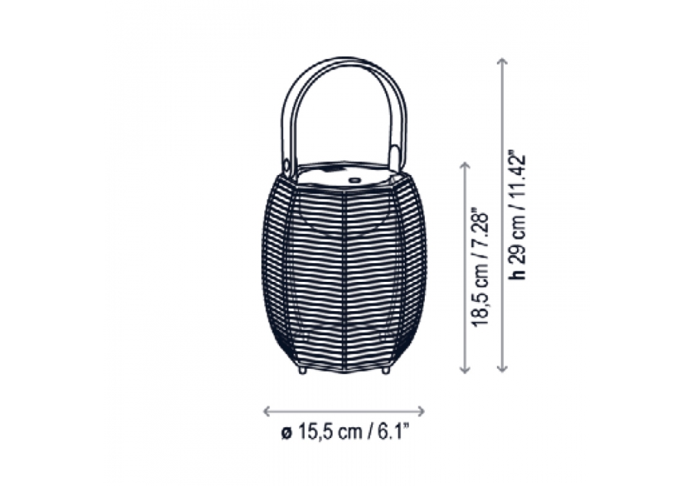 Tanit von Gonzalo Milà für Bover entworfen ist eine wiederaufladbare Tischleuchte mit Sockel und Stützstruktur aus Eisen und Silikon. Der Lampenschirm besteht aus Baumwollseil mit einem inneren Diffusor aus weißem Polycarbonat und schirmt eine LED-Lichtquelle mit Ein-/Ausschalter ab.