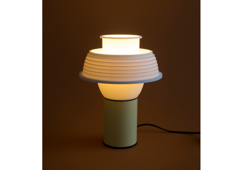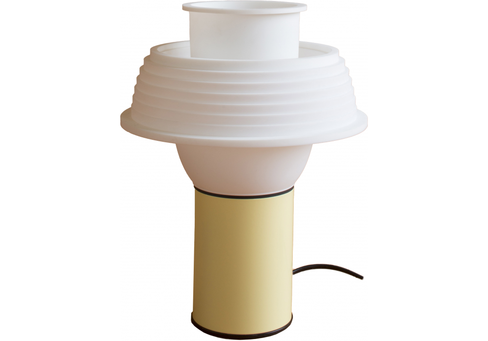 TL2 von Sowden ist eine LED-Tischleuchte mit Silikon-Lampenschirm in weißer Ausführung und gelbem Aluminium-Lampenkörper.