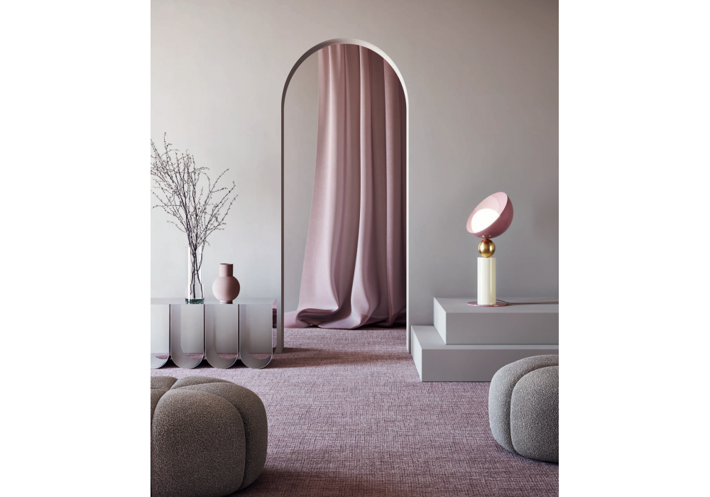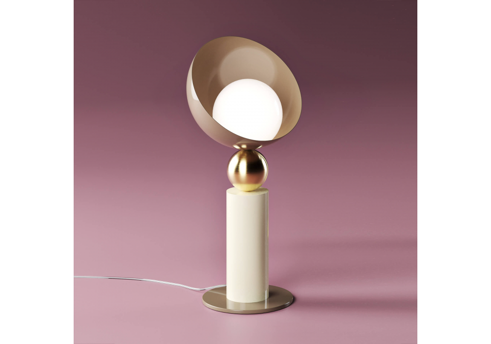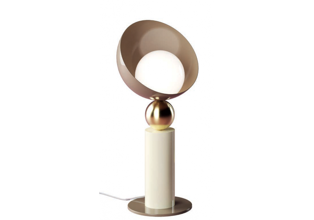 Aurora von Virginia Cei für Italamp entworfen, ist eine LED-Tischleuchte aus lackiertem Metall und einer zentralen Kugel in gebürstetem Hellgold. Der Diffusor besteht aus weißem Glas.