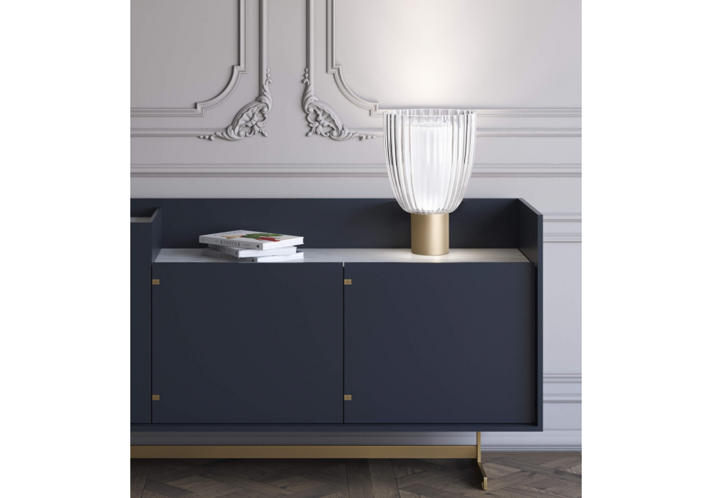 Universale von Virginia Cei für Italamp entworfen, ist eine Tischleuchte aus geschnitztem Kristall mit internem Diffusor aus geblasenem und satiniertem Glas. Metallsockel in den Ausführungen Champagner matt, Bronze matt oder Schwarz matt.