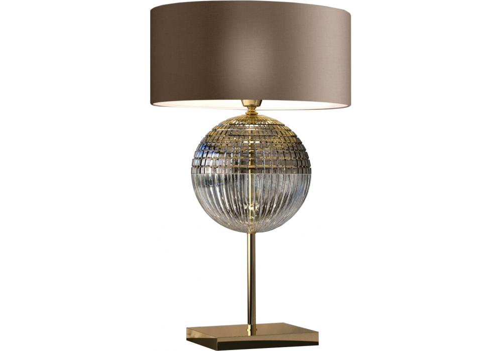 Brigitta und hergestellt von Italamp entworfen, ist eine Tischleuchte mit Metallstruktur in Nickelgold, kugelförmigem Körper aus transparentem, geschnitztem Kristall und Teakholz mit Stoffdiffusor in taubengrauer Ausführung.