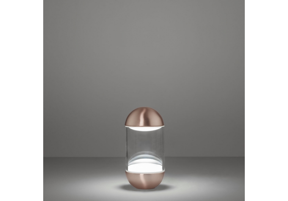 Pillolina von Parisotto + Formenton für Firmamento Milano entworfen, ist eine Tischleuchte mit indirektem Licht und wiederaufladbaren Batterien, hergestellt mit einem Sockel aus geformtem Aluminium und einem Diffusor aus satiniertem Polycarbonat und Borosilikatglas. Verfügbar in mehreren Ausführungen.