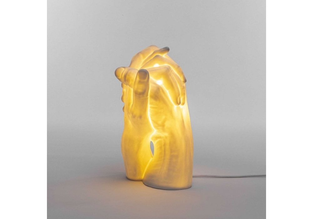 Whit Me von Marcantonio für Seletti entworfen, ist eine Tischleuchte die vollständig aus weißem Porzellan besteht und die Vereinigung zweier Hände darstellt. Die verwendete Lichtquelle ist vom Typ LED.
