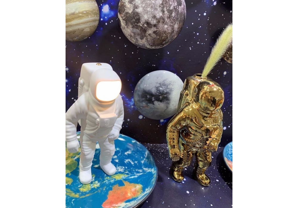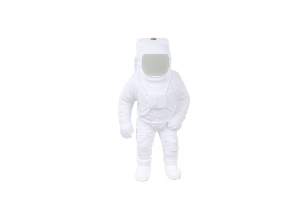 Flashing Starman entworfen und hergestellt von Seletti in Zusammenarbeit mit Diesel Living ist eine Lampe in Form eines Astronauten, die vollständig aus weißem Harz besteht und über eine dimmbare LED-Lichtquelle verfügt, die über ein USB-Kabel betrieben wird.