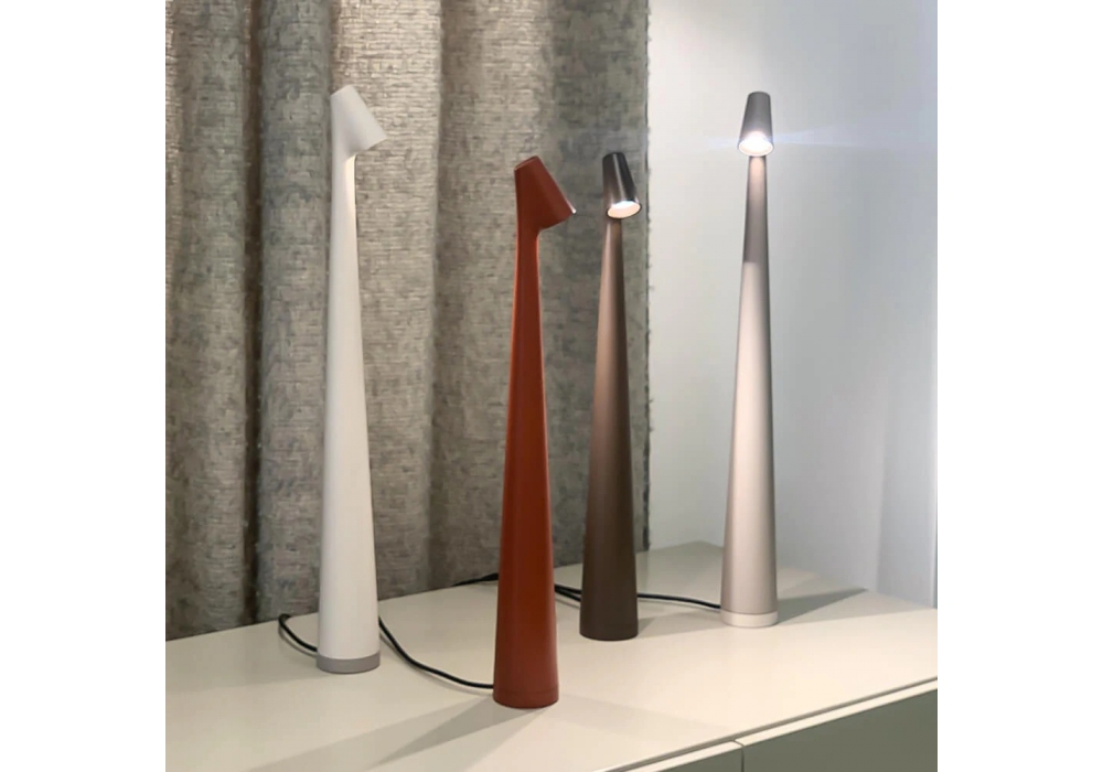 Africa entworfen von Ichiro Francisco Gomez Paz für Vibia ist eine wiederaufladbare Tischleuchte mit konischer Struktur, die vollständig aus lackiertem Aluminium besteht. Der Diffusor besteht aus Polycarbonat und schirmt eine LED-Lichtquelle ab. Africa ist in verschiedenen Ausführungen und Modellen erhältlich.