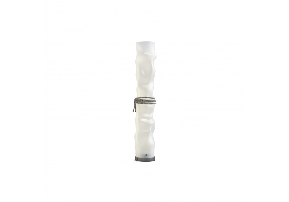 Baggy von Paola Navone für Contardi entworfen ist eine Tischlampe mit einem grauen runden Sockel und einem unregelmäßigen zylindrischen Lampenkörper aus bi-satiniertem Polycarbonat und weißem und grauem Stoffseil. Bei der Lichtquelle handelt es sich um eine Streifen-LED mit einem dimmbaren System am Stromkabel. Baggy ist in verschiedenen Modellen erhältlich.