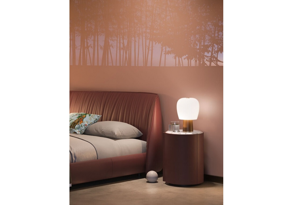 Nymph von Sebastian Herkner für Poltrona Frau entworfen ist eine Tischleuchte mit einem kegelstumpfförmigen Sockel und einer Struktur aus natürlichem Messing, die mit Pelle Frau® überzogen ist. Der Lampenschirm hat eine abgerundete Form aus geblasenem Glas mit gerippter Verarbeitung und einen zylindrischen Diffusor aus Polymethylmethacrylat. Als Lichtquelle kommt ein LED-Modul mit Touch-Ein/Aus-Schalter und Dimmbarkeitssystem zum Einsatz. Nymph ist in verschiedenen Ausführungen und Modellen erhältlich.