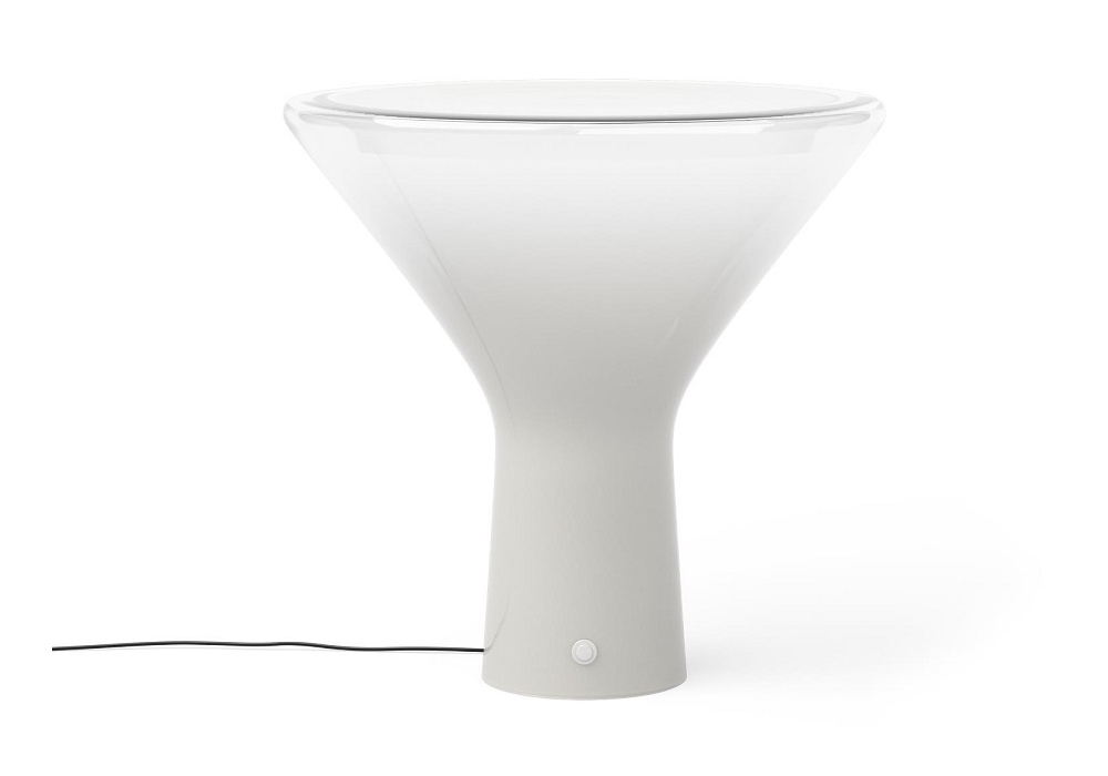 Accelsa von Angelo Mangiarotti für Karakter entworfen, ist eine Tischleuchte aus mundgeblasenem Glas und Stoffkabel.