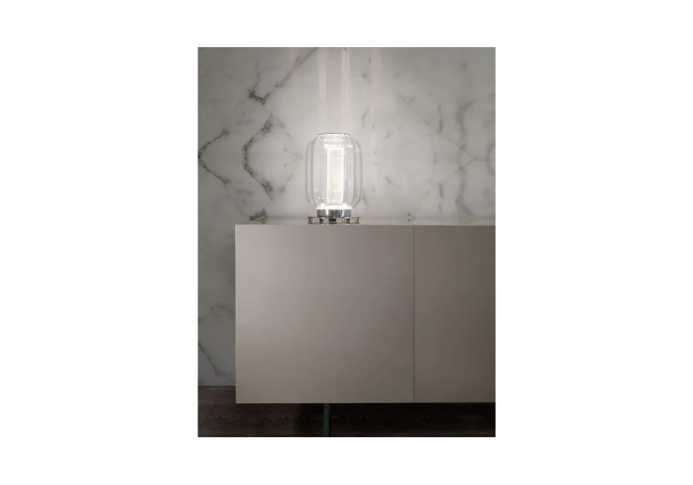 Lantern von Tulczinsky für Reflex Angelo entworfen, ist eine Tischleuchte aus Kunstglas in transparent, Aquamarin und Strohgelb. Interner Diffusor aus Glas mit Rugiada-Finish und Glasabdeckung mit Magnet. Sockel aus poliertem Chrommetall, LED-Beleuchtungssystem mit Strahler und Streifen.