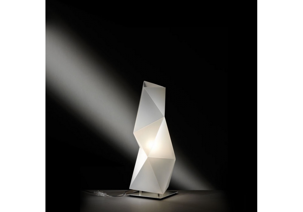 Diamond entworfen von Paolucci, Statera für Slamp ist eine Tischlampe mit viereckigem Sockel aus Aluminium und einem Lampenkörper mit einer skulpturalen und unregelmäßigen Form in der Farbe Weiß. Bei der verwendeten Lichtquelle handelt es sich um eine Glühfaden-LED.