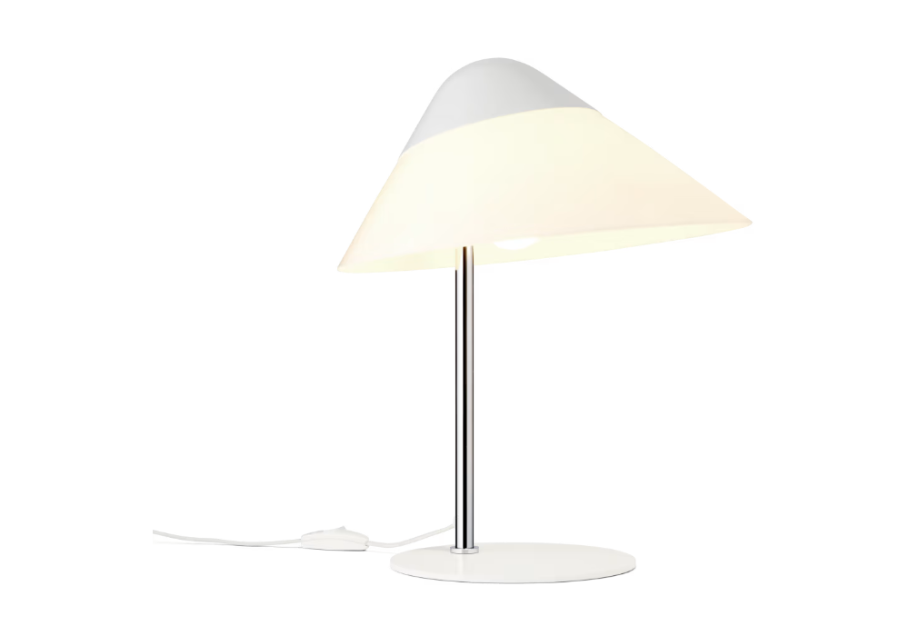 HJW01 Opala Table Lamp von Hans J. Wegner für Carl Hansen & Søn entworfen, ist eine Tischlampe aus verchromtem und lackiertem Stahl. Opaler Acryllampenschirm. Am Gehäuse befindet sich ein Schalter (schwarzes Kabel für schwarze Lampe; weißes Kabel für weiße Lampe).