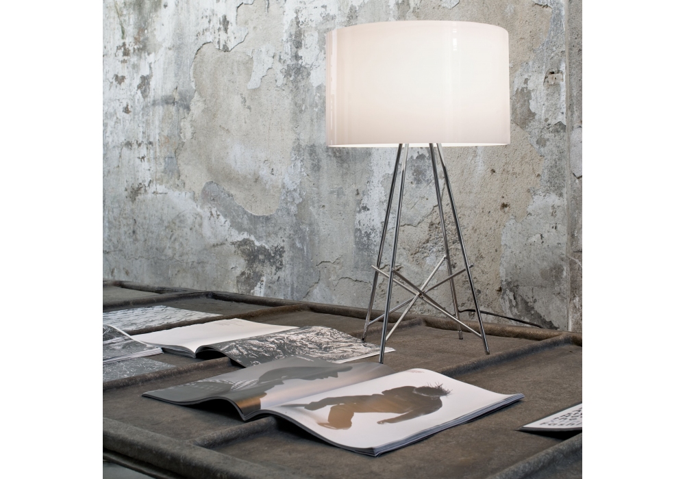 Ray T von Rodolfo Dordoni für Flos entworfen, ist eine Tischleuchte mit diffusem Licht. Sie zeichnet sich durch eine Struktur aus verchromtem Stahlrohr mit einer Trägerscheibe aus polierter und verchromter Zamak-Legierung aus. Der innere Diffusor aus opalem Polycarbonat sorgt für eine gleichmäßige Lichtverteilung. Die äußeren Diffusoren sind aus glänzend weiß oder schwarz lackiertem Aluminium oder aus edlem, grau ummanteltem und mundgeblasenem Glas mit glänzender Oberfläche erhältlich. Das Kabel ist mit einem elektronischen Dimmer zur stufenlosen Regulierung der Lichtintensität ausgestattet. Die transparenten PVC-Füße sorgen für Stabilität und schützen Oberflächen. Leuchtmittel nicht enthalten.