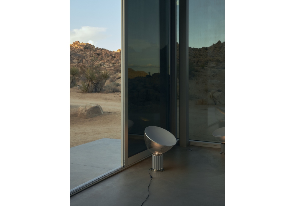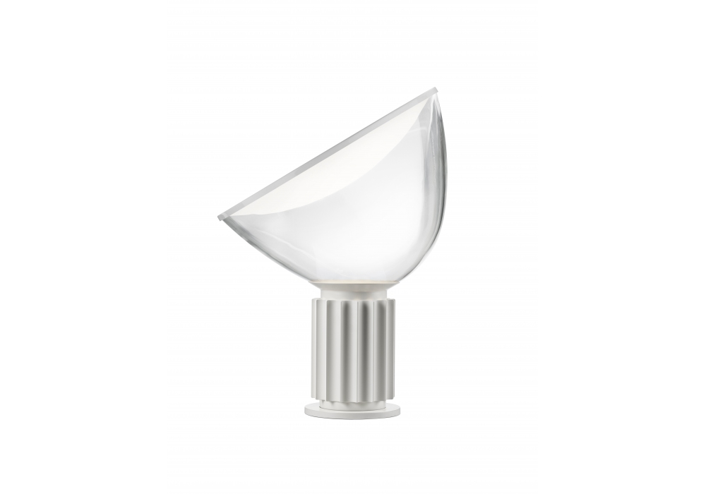 Taccia von Achille & Pier Giacomo Castiglioni für Flos entworfen ist eine Tischleuchte mit indirektem und reflektiertem Licht. Reflektor aus glänzend weiß lackiertem Metall mit Flüssigkeit innen und weißem Pulver außen. Verstellbarer Diffusor aus transparentem, geblasenem Glas. Korpus aus lackiertem, extrudiertem Aluminium. Sockel aus poliertem, vernickeltem und zaponiertem Stahl. Dimmer und LED inklusive.