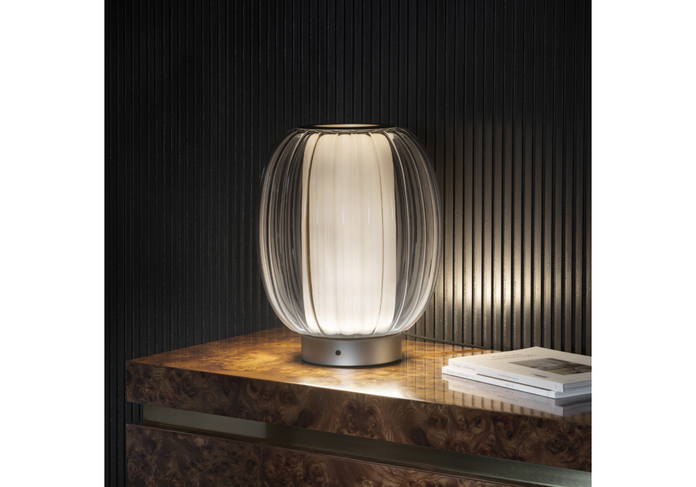 Alma von Controvento für Contardi entworfen, ist eine Tischleuchte mit champagnerfarbener Struktur, einem Diffusor aus transparentem Glas und einem Innendiffusor aus weißem Plissee-Stoff.