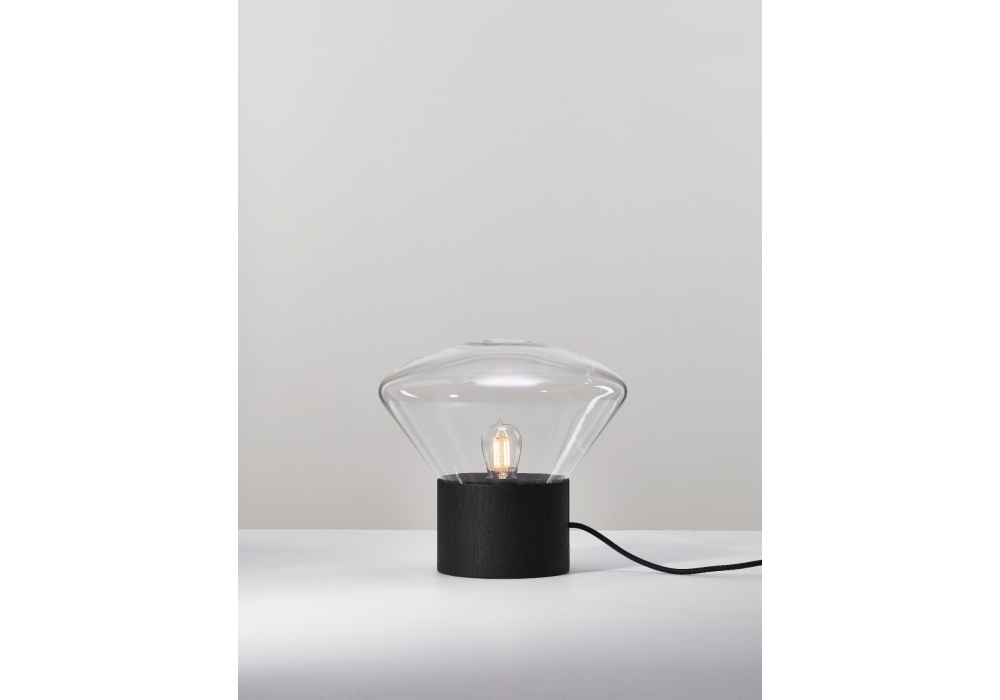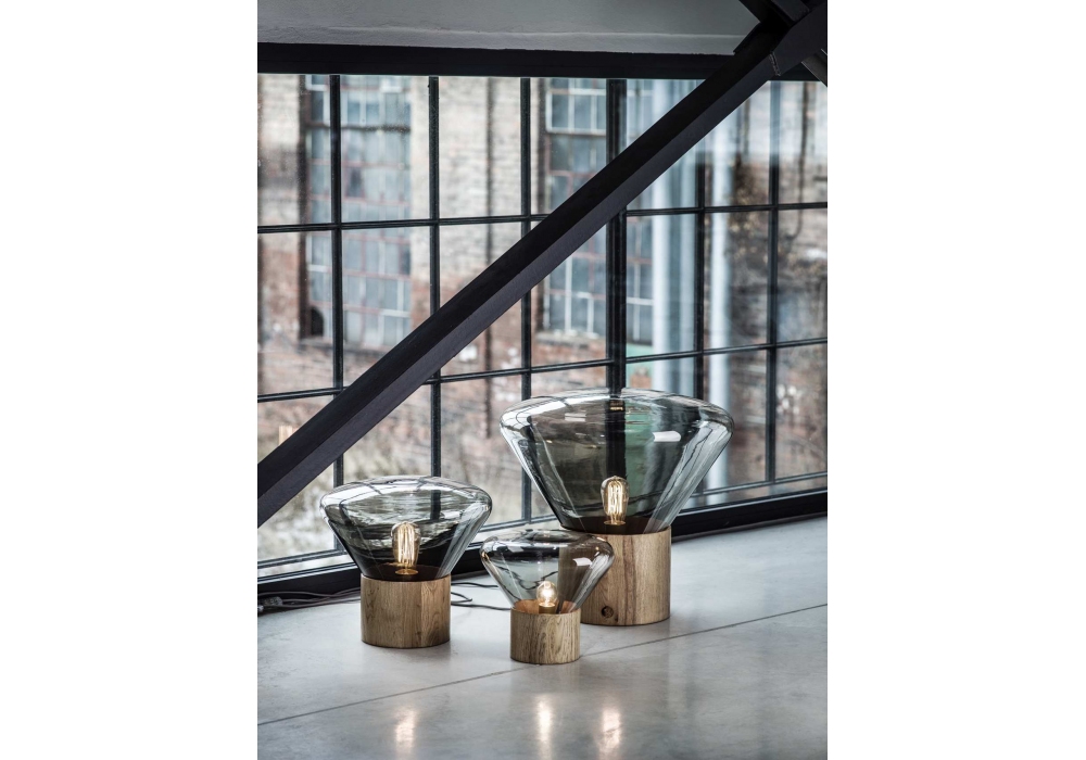 Muffins Mini Wood 06 von Dan Yeffet und Lucie Koldová für Brokis entworfen, ist eine Tisch-/Stehlampe mit Diffusor aus schattiertem Glas in verschiedenen Farben. Die Basis hat eine zylindrische Form in verschiedenen Ausführungen aus behandeltem oder natürlichem Holz. Die gewählte Lichtquelle ist vom LED-Typ.