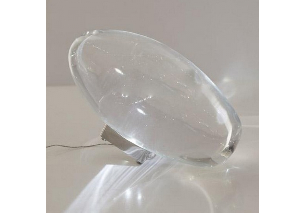Atman von Enzo Catellani für Catellani & Smith entworfen, ist eine Tischlampe mit LED-Lichtquelle, die durch einen Kristall projiziert wird, eine Art Schmucklampe. Es besteht aus ovalem Kristall mit Nickelbasis und Schwarz-Dimmer.