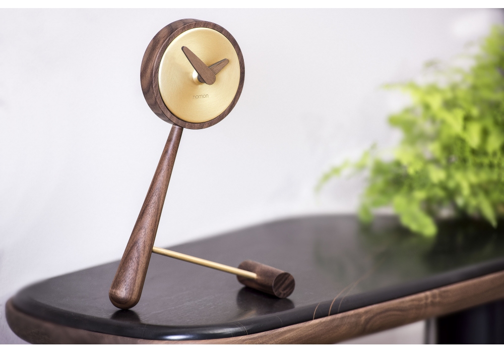 Mini Puntero, entworfen und hergestellt von Nomon, ist eine Tischuhr mit Gehäuse und Zeigern aus Walnussholz, zentralem Gehäuse aus poliertem Messing oder Graphit-Finish.