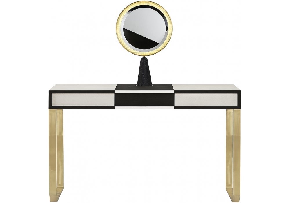 Selene von Pietro Russo für Gallotti&Radice entworfen, ist ein Toilettentisch aus Holz Taba Frisé weiss und Tanganika schwarz. Metallteile Messing satiniert. Spiegel Extralight 6mm mit Facettschliff. Mit LED Lichtquelle (15 watt; 108lm/w; 3000k). Metallteile aus Messing satiniert und Gestell aus Marmor Nero Marquinia.