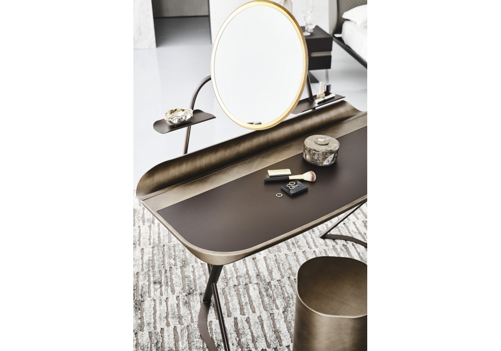 Cocoon Trousse Leather von Paolo Cattelan für Cattelan Italia entworfen, ist ein Schreibtisch mit lackiertem Stahlgestell. Top aus Leder in mehreren Farben mit Brushed Bronze oder Brushed Grey lackiertem abgerundetem Profil mit gerilltem Objekthalter aus Metall lackiert Brushed Bronze oder Brushed Grey. Spiegel mit Gestell in Stahl lackiert mit Seiten-trägern und Böden aus Stahl lackiert. LED-Beleuchtung.