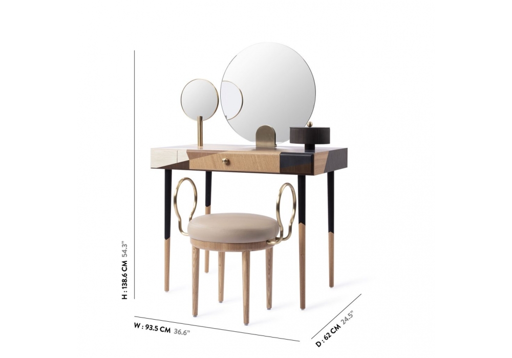 Rose Selavy Marquetry von Thomas Dariel für Maison Dada entworfen, ist ein Schminktisch mit viereckiger Platte aus Sperrholz und MDF mit eingelegtem Eschenfurnier. Beine aus Metall mit Eschenfurnier und Intarsien. Alle Metallteile sind in glänzendem Champagner plattiert. Rose Selavy Marketerie ist in der Version mit oder ohne Hocker erhältlich.