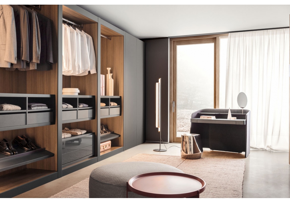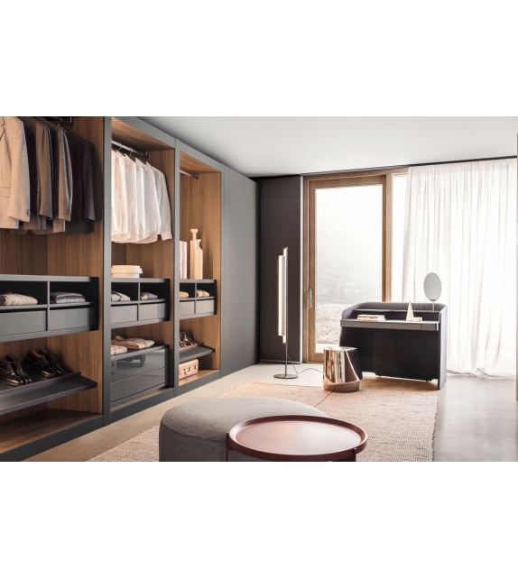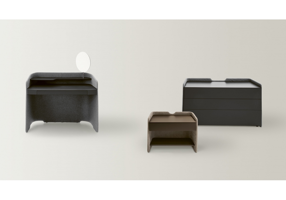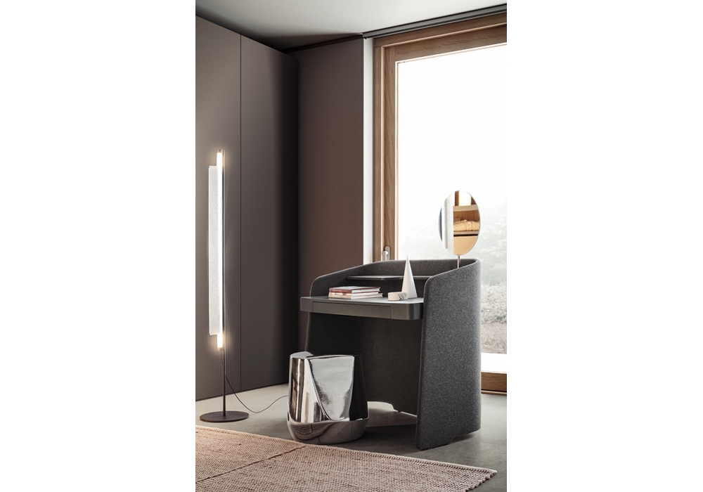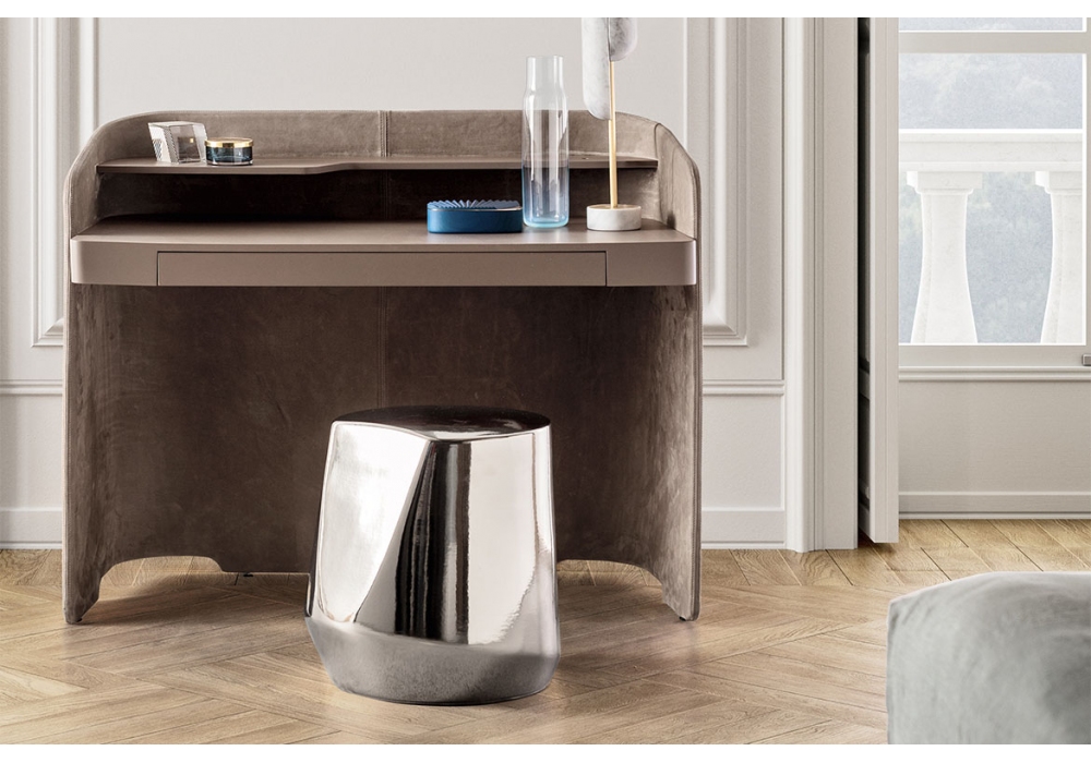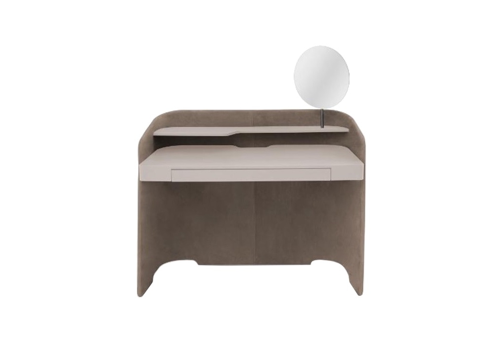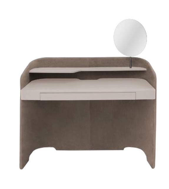 Chloé Vanity von Emmanuel Gallina für Pianca entworfen, ist ein Schminktisch mit einer Struktur aus gebogenen geschichteten Paneelen, die mit Mikropolsterung aus Stoff, Leder und Kunstleder bedeckt sind. Platte aus matt lackierten MDF-Platten. Komplett mit silbernem Spiegel mit Struktur in Metallausführung. Verfügbar in mehreren Ausführungen.
