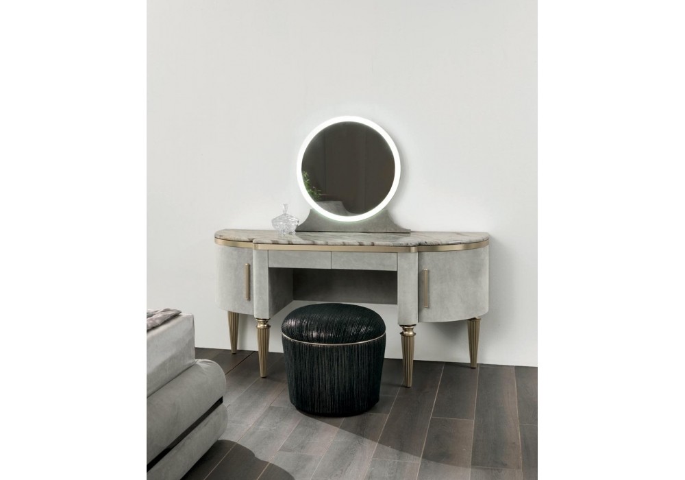 Dame von Giuseppe Iasparra für Longhi entworfen, ist ein mit Leder bezogener Schminktisch aus Holz mit zwei kleinen Schubladen und zwei gebogenen Seitentüren. Basis und Griffe aus gerilltem Metall und geformte Platte aus Marmor. Runder Spiegel mit lederbezogener Basis wie das Gehäuse, Metallkante, Leuchtband am Umfang des Spiegels mit dimmbarem LED-Licht.