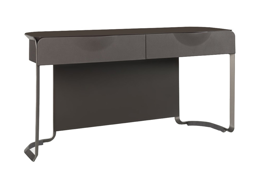 Milano von Blengini Ghirardelli für Turri entworfen, ist ein Toilettentisch mit Struktur aus MDF und Sperrholz mit Polsterung aus verschiedenen Ledern. Die Platte besteht aus Holz in glänzend lackierter Ausführung. Es gibt zwei Schubladen mit Mikrofaserfutter. Metallbeine in gebürstetem Nickel-Finish mit Lederapplikationen.