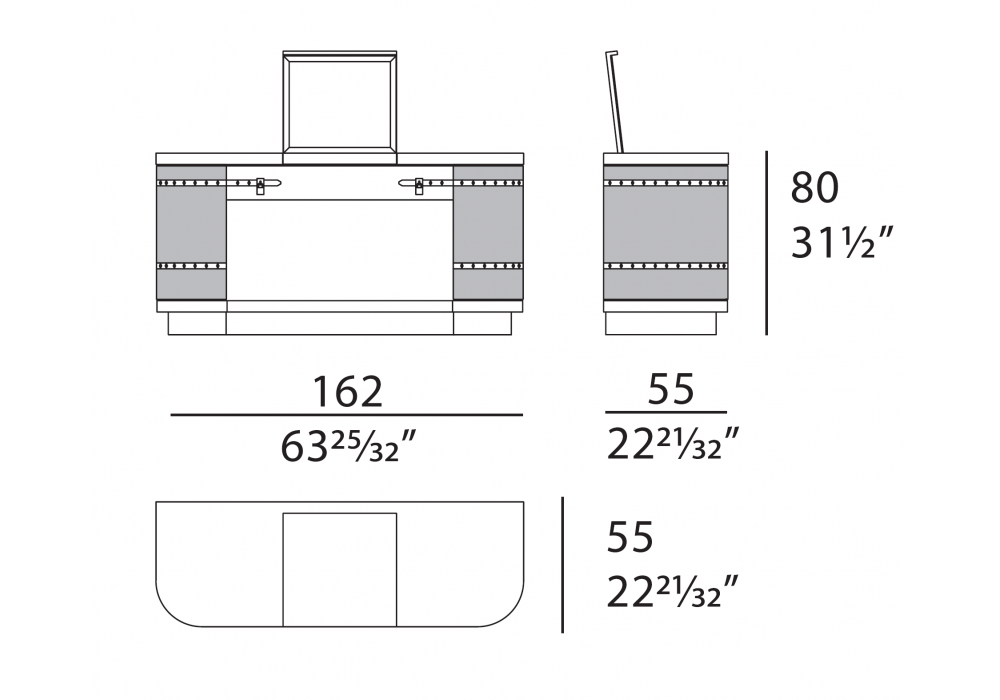 Diamond von Giovanni Cagnato für Turri entworfen, ist ein Toilettentisch mit Struktur und Platte aus MDF, Sperrholz und Spanplatten in glänzender Ausführung, Griffen und Details aus vergoldetem Metall. An der Klapptür befindet sich ein Spiegel.