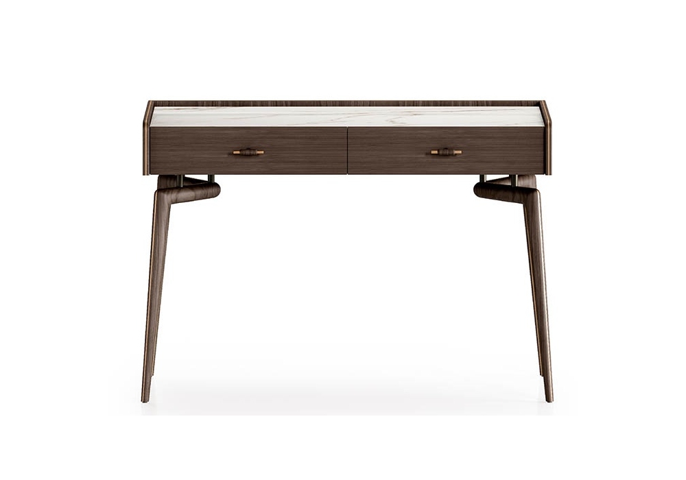 Blues von Giuseppe Viganò für Turri entworfen, ist ein Toilettentisch mit Struktur aus furniertem Nussbaum und Beinen aus massivem Nussbaum. Die Fronten können in Nussbaum furniertem Holz oder mit Leder bezogen sein. Platte aus Marmor, Leder oder Nussbaumfurnier.